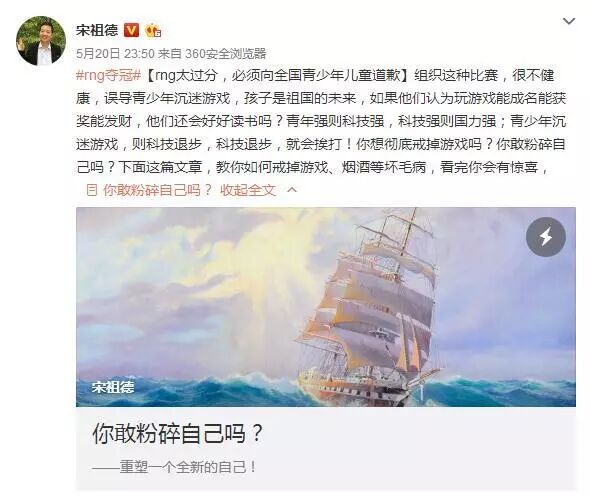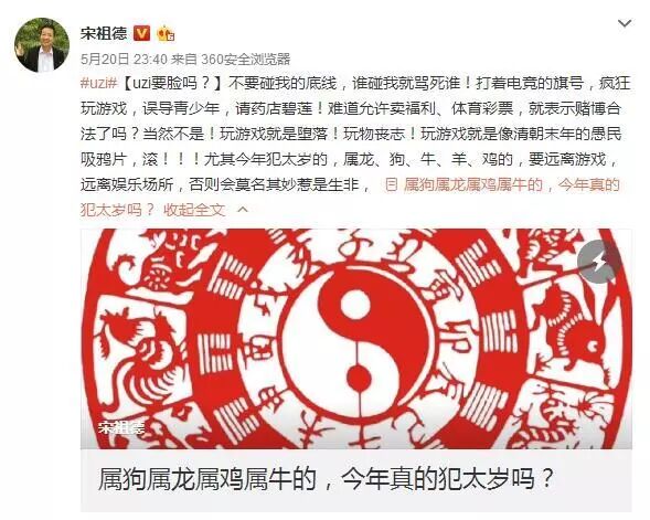 从上面的截图中我们也可以看出,宋祖德对游戏是持排斥态度的,事实也是如此,他不仅炮轰鹿晗吃鸡玩电竞,甚至5月20日,在大家欢祝RNG夺冠为国争光的时候,他骂完uzi骂RNG,直言“uzi要脸吗?”、“rng太过分,必须向全国青少年儿童道歉”。