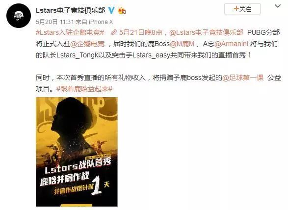 不过虽然收到很多的直播礼物,但Lstars战队表示这次直播的所以收入都将作为公益,捐给鹿晗自己发起的足球公益项目。