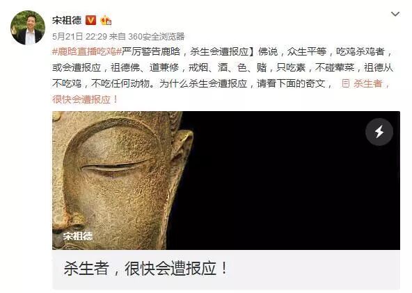 同一天晚上,著名毒嘴宋祖德发微博痛斥鹿晗吃鸡杀生、会遭报应。