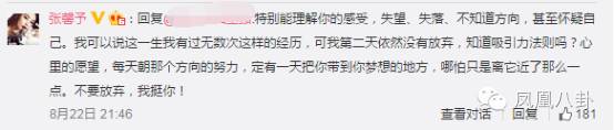 比如有网友正处于艺考的迷茫期,求问怎么办。张馨予以自身经历开导她:“我一生中有无数这样的经历,可是我第二天依然没有放弃。”并拿出吸引力法则告诉粉丝,“每天朝那个方向努力,定有一天把你带到你梦想的地方。”