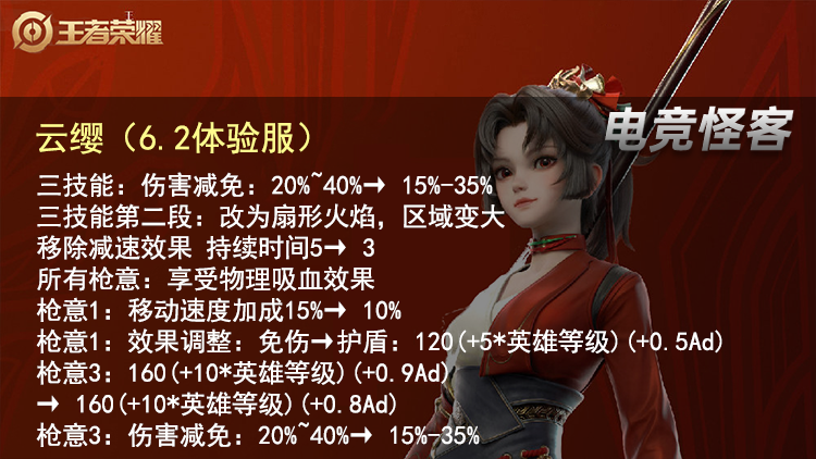 云缨目前仍在体验服进行测试,预计下个赛季会正式上线,这里怪客把云缨的调整内容分享出来,就不做具体分析了。因为后续可能还会有很多调整。