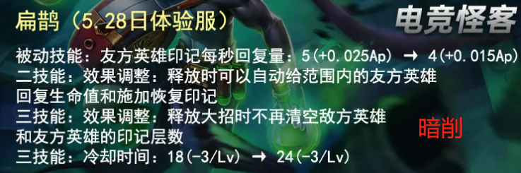 三技能生效范围扩大,但复活血量略微下调,个人感觉算是一次平行调整吧。