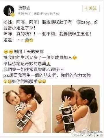 9月30日下午,贾静雯在微博承认已经怀上第三胎。感恩:谢谢上天的安排。
