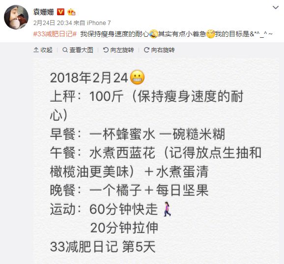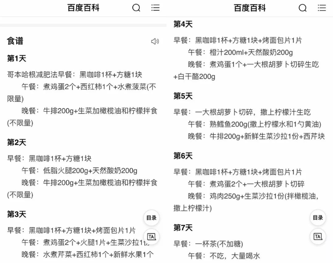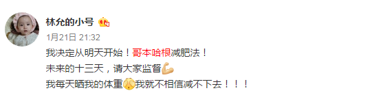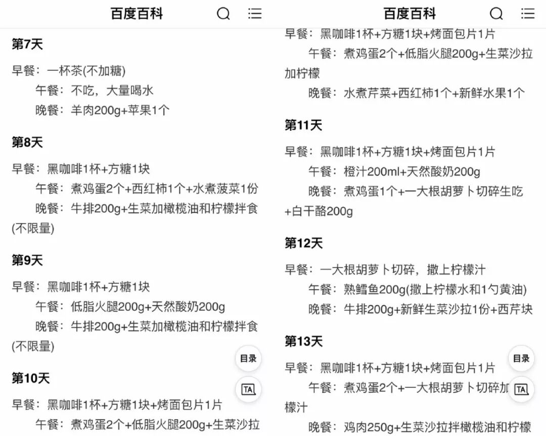 翻了她的微博小二发现,她一开始尝试了很火的“哥本哈根”减肥法,这个方法有个13天减肥食谱,号称天天这样大鱼大肉13天下来也能减肥10斤,这种方法受到很多想减肥又不想忌口星人的追捧。