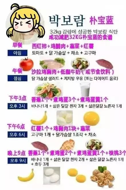 朴宝蓝的减肥食谱以红薯、香蕉这些非常容易有饱腹感的食物为主,控制进食时间配合运动,从154斤狠减到90斤,总共瘦了64斤!