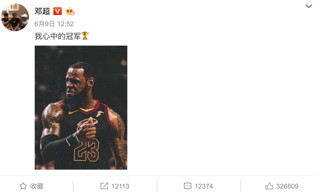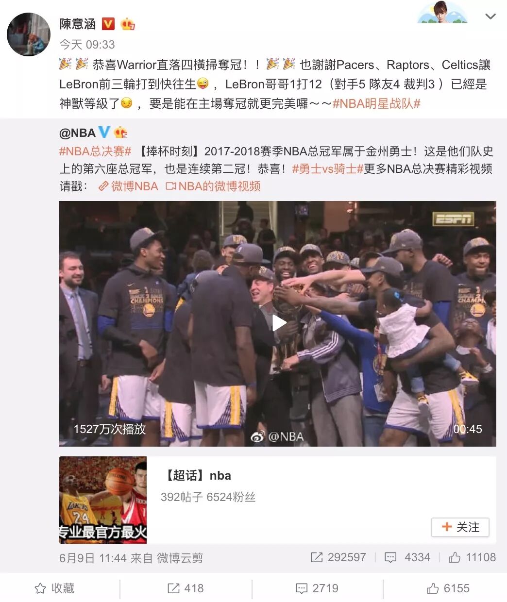 可是,只有这样一位来自台湾的娱乐圈明星,在总决赛结束后的第二天,在公众面前发表的言论,引起了众怒。作为勇士球迷,陈意涵在微博上写道:“恭喜勇士直落四横扫夺冠,也谢谢步行者、猛龙、凯尔特人让勒布朗在前三轮打到快往生,勒布朗哥哥1打12(对手5、队友4、裁判3)已经是神兽级别了,要是勇士能在主场夺冠就更完美咯。”