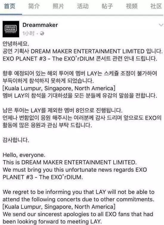 近日,因为萨德,中韩关系变得紧张的敏感时期,EXO巡演主办方宣布:我们很遗憾地通知您,由于其他承诺,LAY(张艺兴)将无法参加以下音乐会。
