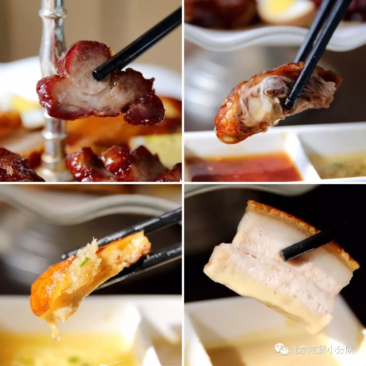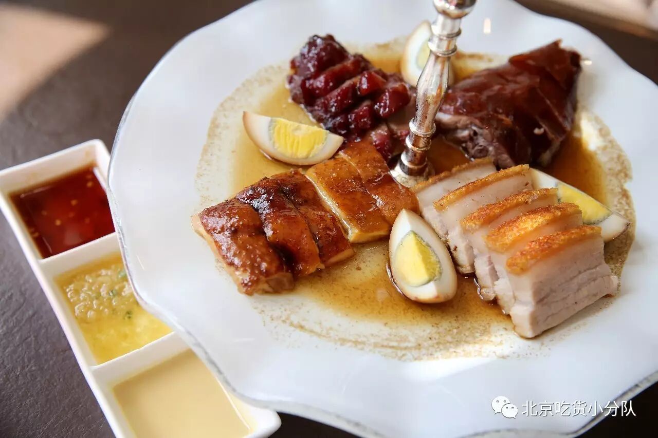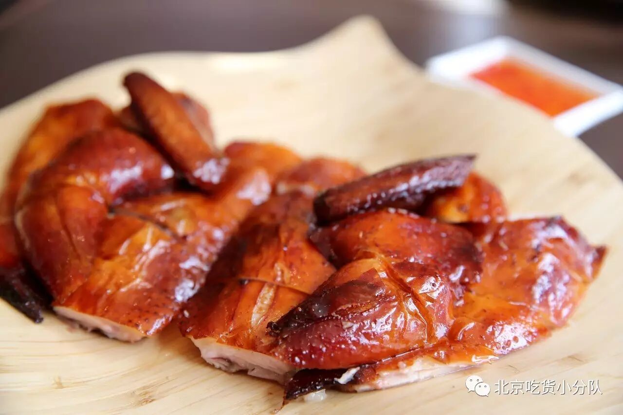叉烧不用蘸料直接吃,判别一块叉烧的好坏从外皮是否呈枣红色就能看出;另外烧鹅也是很主打的,外皮焦黄香脆,肉紧实喷香,配梅子酱最合适啦!