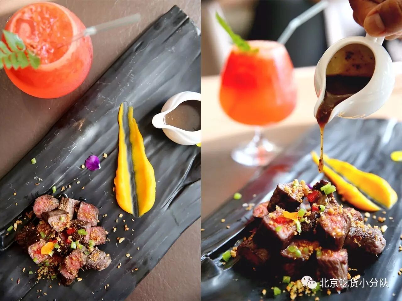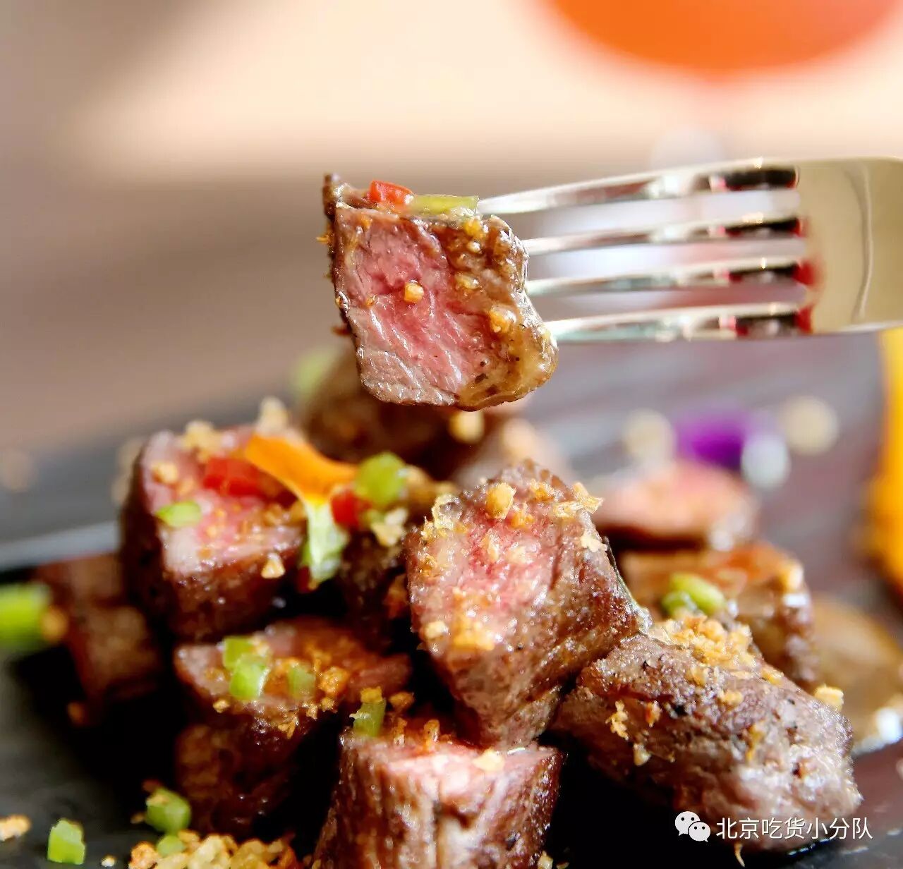 【香煎金蒜牛上脑】选用了牛上脑部位的肉切成小方块煎熟,为了保证牛肉的嫩,特意没有做到全熟,撒上金黄的炸蒜!中西结合的一道横菜!