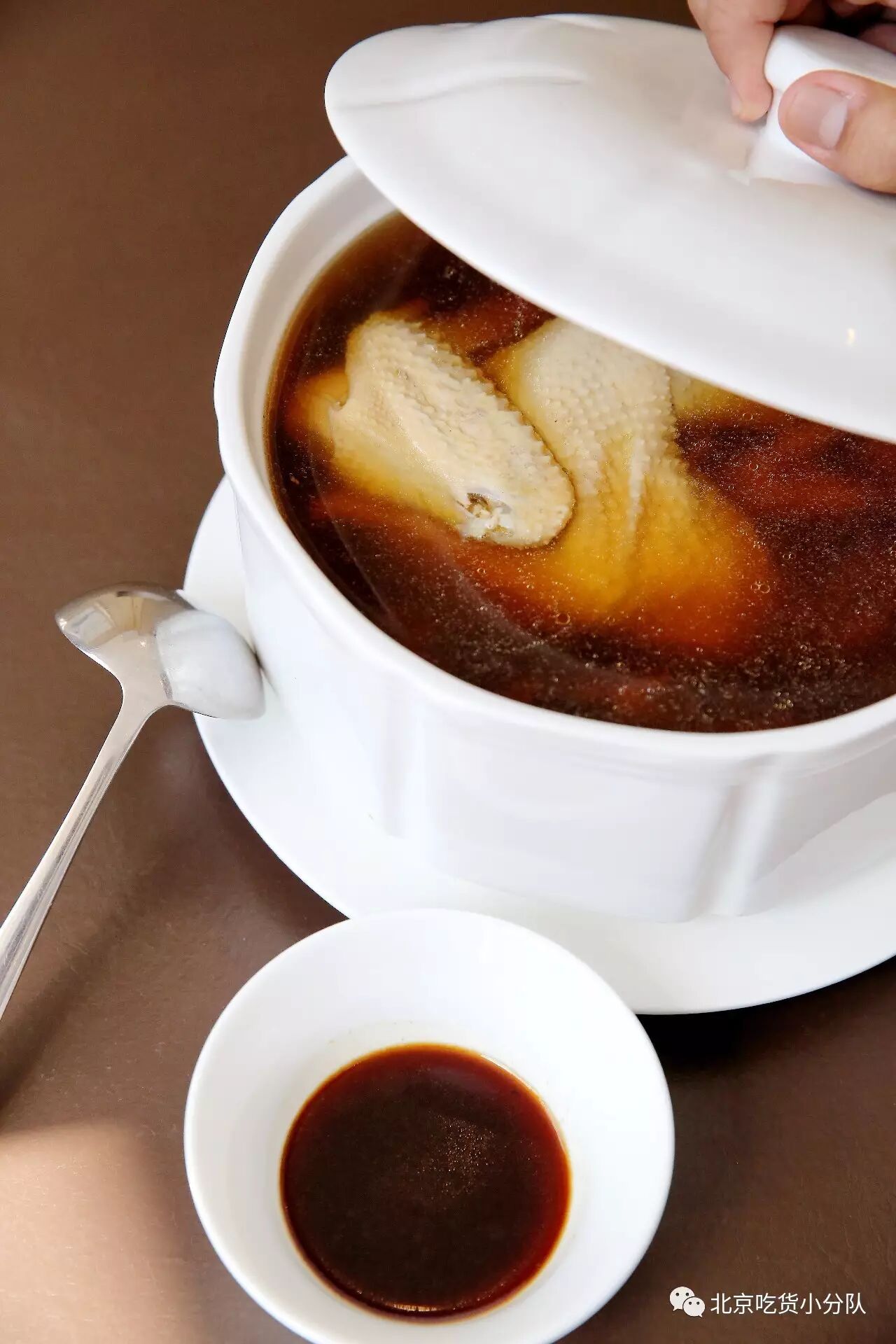 【黑蒜炖汤】炖汤和我们平时经常说的煲汤是完全不同的,炖汤指的是像蒸食物一样,把汤底配料都放好在坛子里,隔水蒸3小时以上,这样能保证汤是清亮的(这款汤因里面有黑蒜,所以颜色较深),而且里面的食材也都还可以食用。