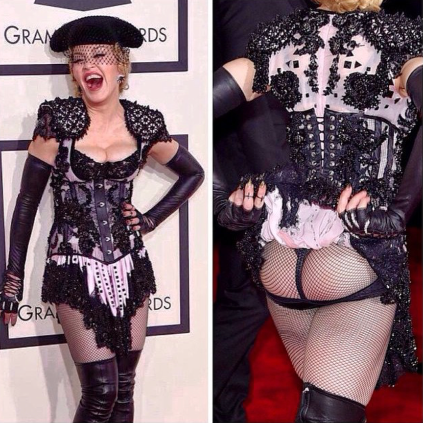 2015 年,Madonna 穿了一件难以定义的米色长袍参加了当年的格莱美颁奖典礼。当她刚刚到达时,并不是十分引人注目,但当她穿着这件带有西班牙斗牛元素与 BDSM 元素相结合的服装,配上鱼网袜和过膝靴,走过红地毯时,留下了令人脸红心跳的经典画面。这套让所有人瞠目结舌的装束是由她的设计师朋友 Riccardo Tisci 设计的,在她隆重登场之后, Cheeky Madge 再次向狗仔确认是否拍到了她的最新造型,以及这位歌手随性展示了她举世闻名的露出臀部的画面。