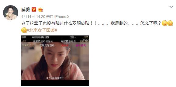 对此,戚薇的回应是“老子这辈子也没贴过什么双眼皮贴!!我是割的……”