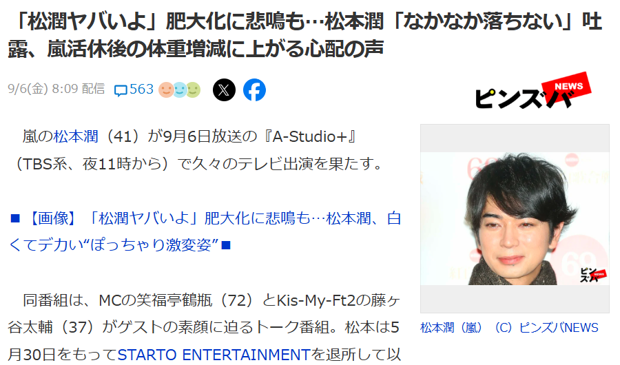 日本媒体猜测松本润可能恋爱也没错,毕竟日本男明星一向就有一些恋爱就发福的传统。