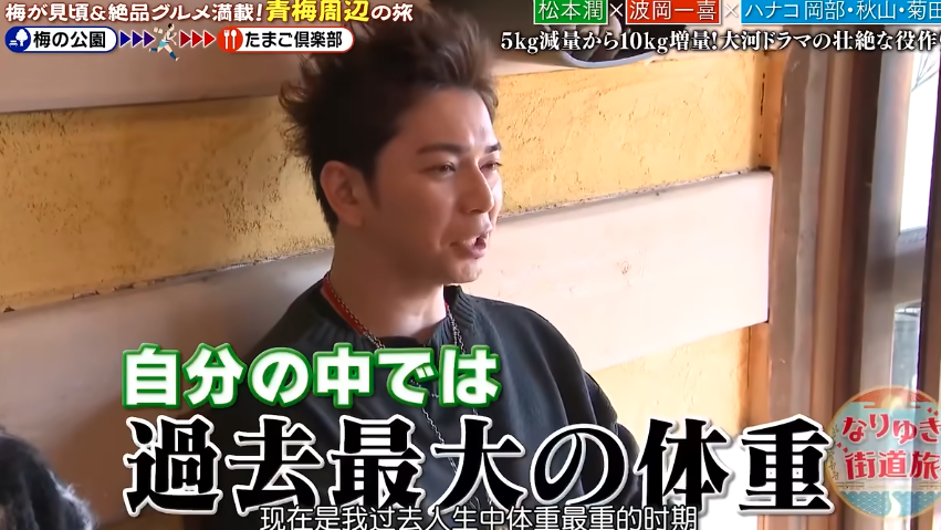 为了增重,一向克己的松本润也是放开了吃,经常大半夜地干碳水,拉面一碗接一碗地吃。原本的目标是只想增重七、八公斤左右,最后胖了快十公斤,达到了松本润生涯最大体重。
