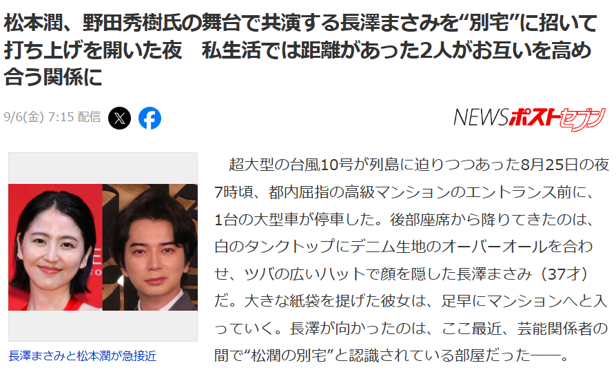 起因是日媒拍到了长泽雅美前往号称“松本别墅”的公寓的照片。