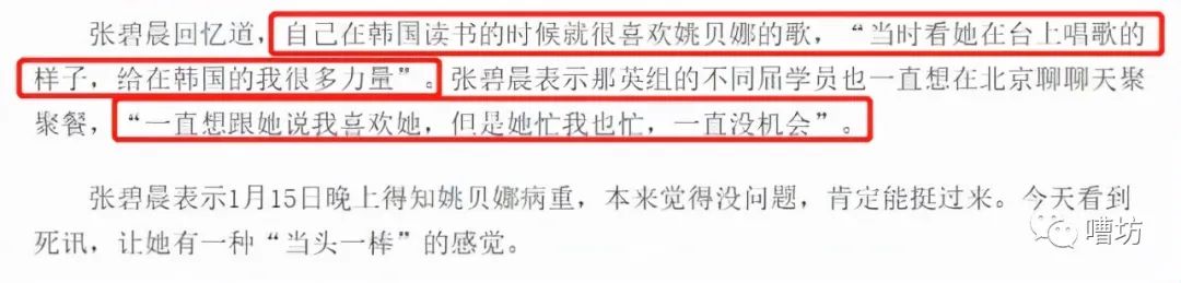 张碧晨曾接受采访表示:姚贝娜一直是她尊敬的人。