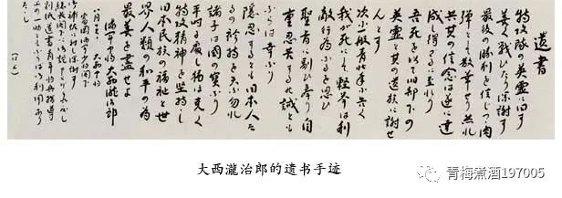 儿玉在书桌上找到了大西的遗书,上边写道:“我谨向无畏的特攻队员们的英灵致以深深的谢意。他们怀抱着必胜的信念英勇捐躯。我未能实现这一胜利,深为自责,在此我希望以死来向这些战殁飞行员的英灵及他们的遗属谢罪。”在信的最后,大西说,“蛮干只能帮助敌人,日本青年应从我的死中吸取精神力量。你们必须始终不渝地遵守圣旨精神。你们是国家的栋梁,要用特攻队员的精神力量为日本民族的福祉和世界和平而奋斗。”信的旁边有一句“徘句”,是大西写给朋友增谷梨花的诗: