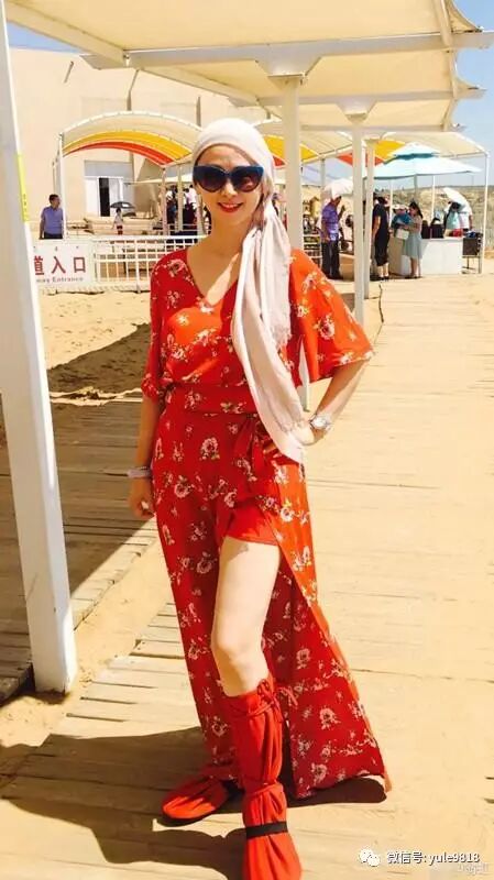 翁虹戴着墨镜裹着头巾,一身红装在烈日下摆着造型,秀着美腿,心情大好。
