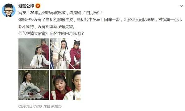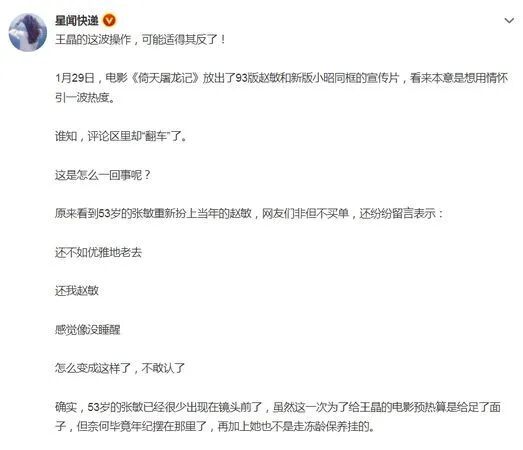 多位娱乐博主认为,电影操作怀旧情怀过了头,历史博主「紫禁公子」表示,张敏已经没有了当初的顾盼生姿,「当初片中在马上回眸一瞥,让多少人记忆深刻,对续集一点儿都不期待,没有期望就没有失望。何苦毁掉大家童年记忆中的白月光呢?」娱乐博主「星闻快递」直言宣传操作适得其反,「毕竟年纪摆在那里了,再加上她也不是走冻龄保养挂的。所以,这重新扮上赵敏非但没有勾起大家对昔日赵敏的美好回忆,反而破坏了记忆中的美好印象。」