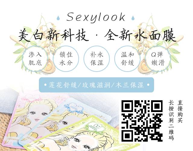 SexyLook白面膜的膜布与肌肤紧密贴合,不放过每一寸肌肤。它有优质的服帖感,可以帮助层层锁住精华。满满精华吸附在膜布上,敷在肌肤上又拥有高渗透性,清新冰凉的触感,夏天敷起来特别的舒适。▼