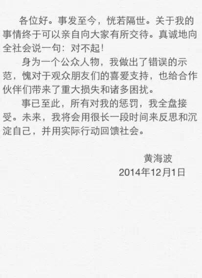 六个月收容教育期满,黄海波在声明中感慨恍如隔世,“关于我的事情终于可以亲自向大家有所交代。真诚地向全社会说一句:对不起!身为一个公众人物,我做出了错误的示范,愧对于观众朋友们的喜爱支持,也给合作伙伴们带来了重大损失和诸多困扰。”