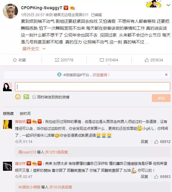 黄子韬在微博称很烦很累,每天重复同样的工作,没回过家,也没属于自己的节日,甚至每天是几号也都不知道,自己什么都不想干了,想停工,想消失。黄晓明、罗志祥纷纷给其加油。老实说,明星的压力确实挺大的。