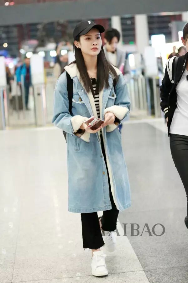 娜扎2017年3月20日北京机场街拍:身着Balenciaga牛仔外套搭配同品牌条纹衬衫裙,踩Saint Laurent运动鞋,佩戴Projekt Produkt太阳镜与Vintage Hollywood耳环