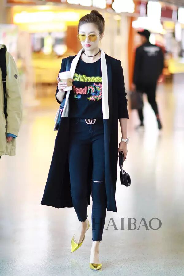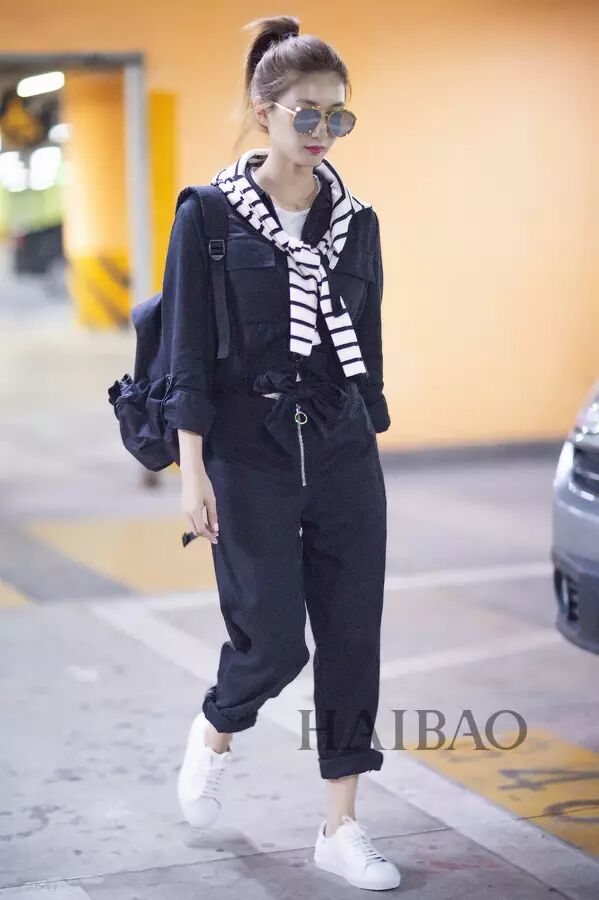江疏影2017年4月7日杭州机场街拍:身着Pinko 2017春夏系列连身裤搭配Comme Des Gargons双肩,踩Axel Arigato运动鞋,佩戴Gentle Monster太阳镜