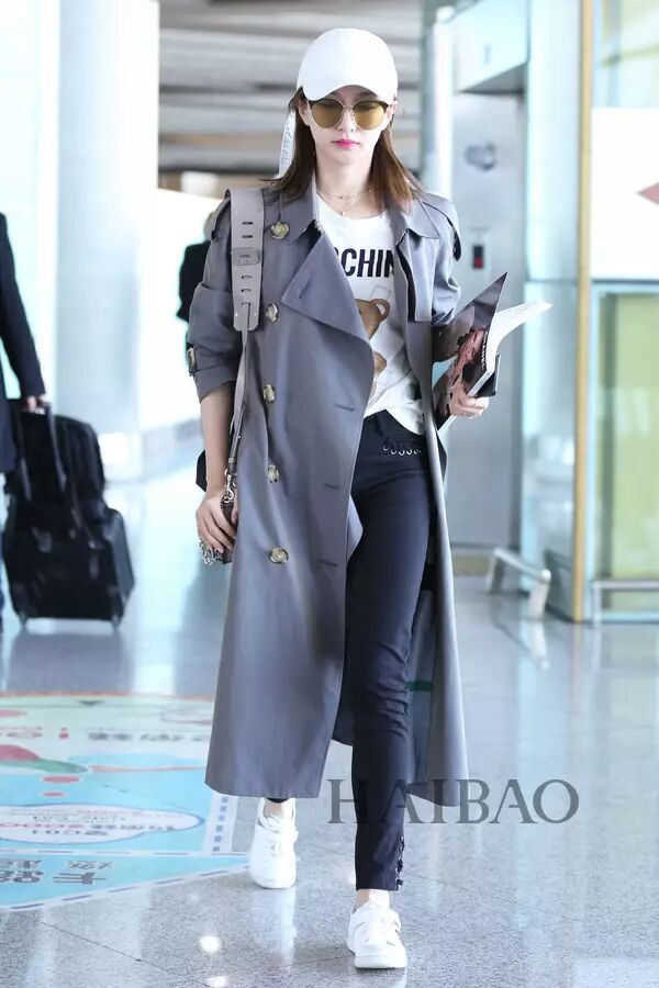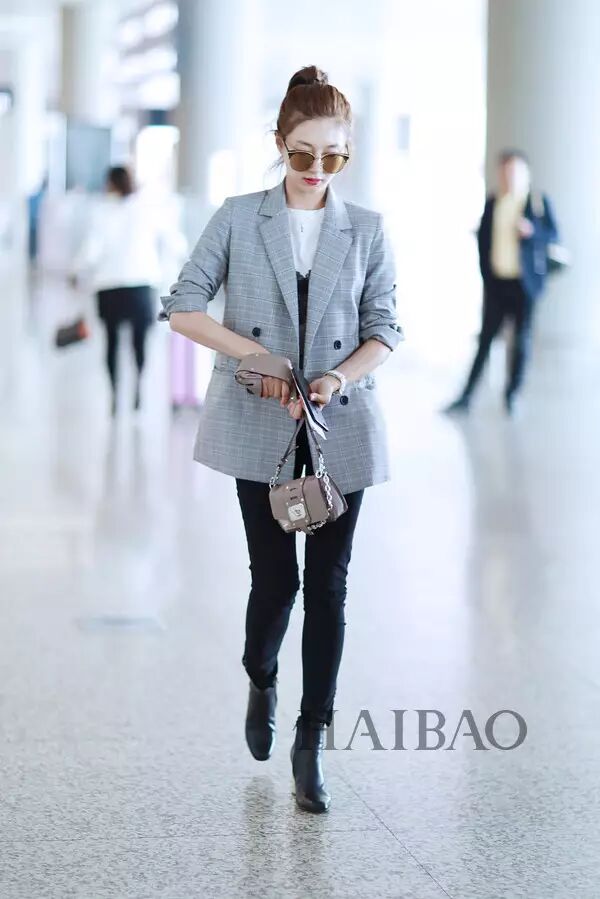 江疏影平时更喜欢穿裤装,不管是灰色格子西装还是黑色外套和灰色长风衣,都搭配百搭的长裤,色调以黑色居多。打造出干练利落不失清爽的OL造型。