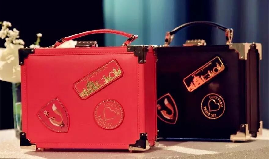 这款包型是传统英伦老式行李箱的迷你版,标贴设计上除了有中国与伦敦标志性的建筑图案,还有她自己设计的狐狸Logo(粉丝给她的昵称为“狐狸”)。