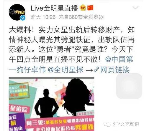 近日,某媒体发了一条引发众议的爆料微博,声称某实力女星出轨并有神秘人曝光铁证!放话下午四点见!一时间让不少网友纷纷表示贵圈真乱!