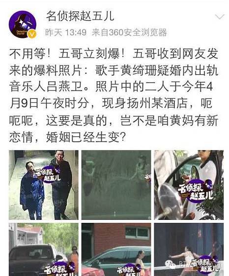 紧接着,昨天下午名侦探赵五儿爆料,坐实事件主人公是女歌手黄绮珊,出轨对象是著名音乐人吕燕卫。