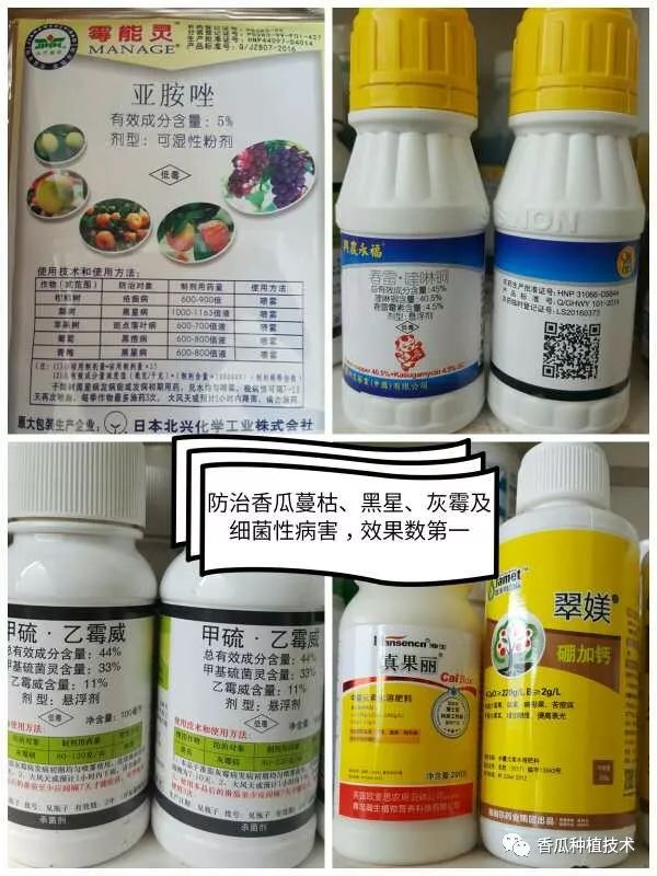防治病虫害 甜瓜生产主要以预防为主,绿色防控,科学筛选药剂,能用烟雾剂防治的不用水剂防治,防治宜早不宜迟。大棚甜瓜在开花前,在控制好温度湿度的同时选用霉能灵、势克等进行保护预防;药液防治尽量避开花期,以防形成畸形果。温室甜瓜白粉病可用甲乙嘧酚磺酸脂2000倍液防治;蔓枯病发病初期喷洒或浇灌甲基立枯磷1500倍液,每株浇灌药液150-300ml;细菌性叶枯病可用加收米1000倍液或喹啉铜2000倍液,每隔7-10天交替喷雾连喷2-3次。