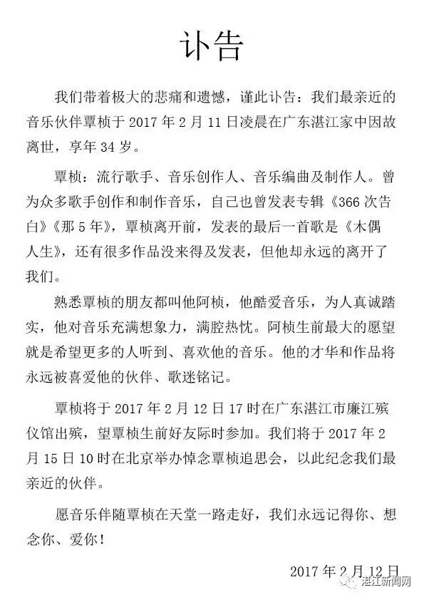 11日凌晨,湛江籍流行歌手、音乐制作人覃桢在湛江家中因过劳离世,年仅34岁。