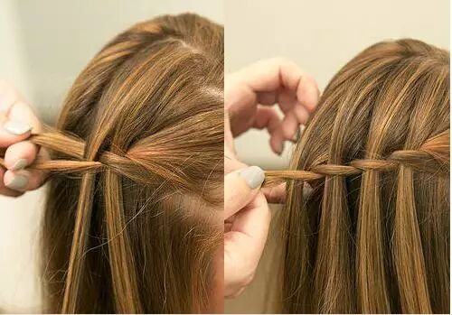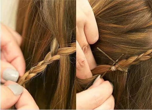 step3:放下新加入发束,如图进行交叉编织,完成第一束瀑布式编发;