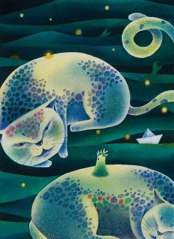 肥嘟嘟的身躯,笨拙懒散的样子,成日最喜欢趴在他身边,尤其是在他创作的时候,总是蹲坐在一边,静静的盯着画板,一动不动,仿佛再思索些什么,因此他希望将他的伙伴在画中出现。
