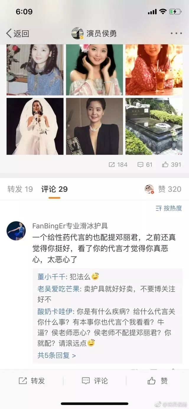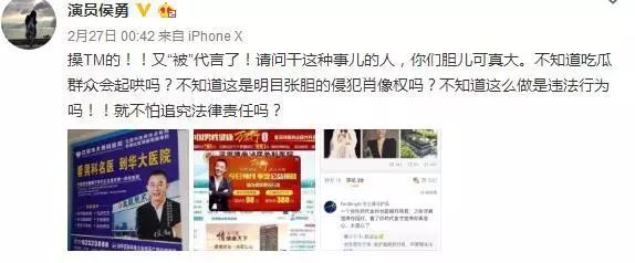 侯勇截图并且怒骂“操TM的!!又“被”代言了!请问干这种事儿的人,你们胆儿可真大。不知道吃瓜群众会起哄吗?不知道这是明目张胆的侵犯肖像权吗?不知道这么做是违法行为吗!!就不怕追究法律责任吗?”