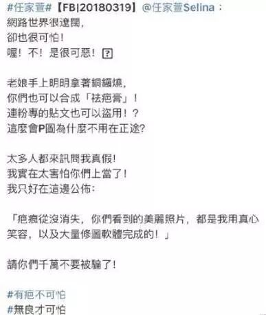Selina说:“疤痕从没消失,你们看到的美丽照片,都是我用真心笑容,以及大量修图软件完成的!”为了不让更多人上当,她才会选择发文声明这件事,“请你们千万不要被骗了!”