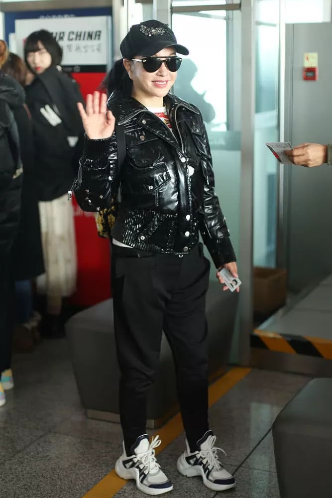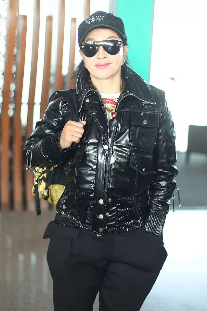 黑色鸭舌帽黑色墨镜,穿着一身黑衣的刘晓庆走出了大姐大的气场,黑色的皮衣穿在她身上,看起来像紧身衣一样,又酷又有型。皮衣是一件很酷的单品,深受时尚人士喜爱,小姐妹们可以穿起自己男朋友的皮衣,让自己看起来又酷又可爱。
