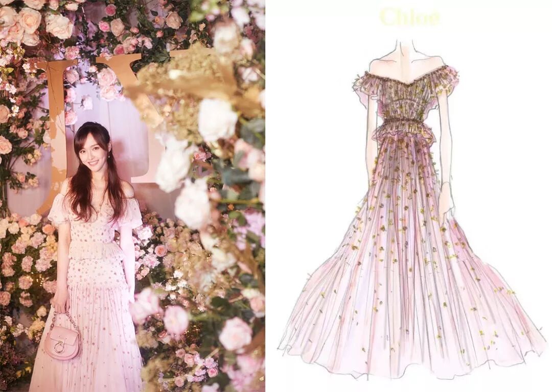 落肩大V,梦幻裙摆,还有细细点缀全身的宝石花朵在粉色礼服上熠熠生光,穿着这件耗时1250小时手工制作的Chloé晚宴礼服穿行过绚烂梦境,落入人间烟火的唐嫣幸福得让时光都染了糖