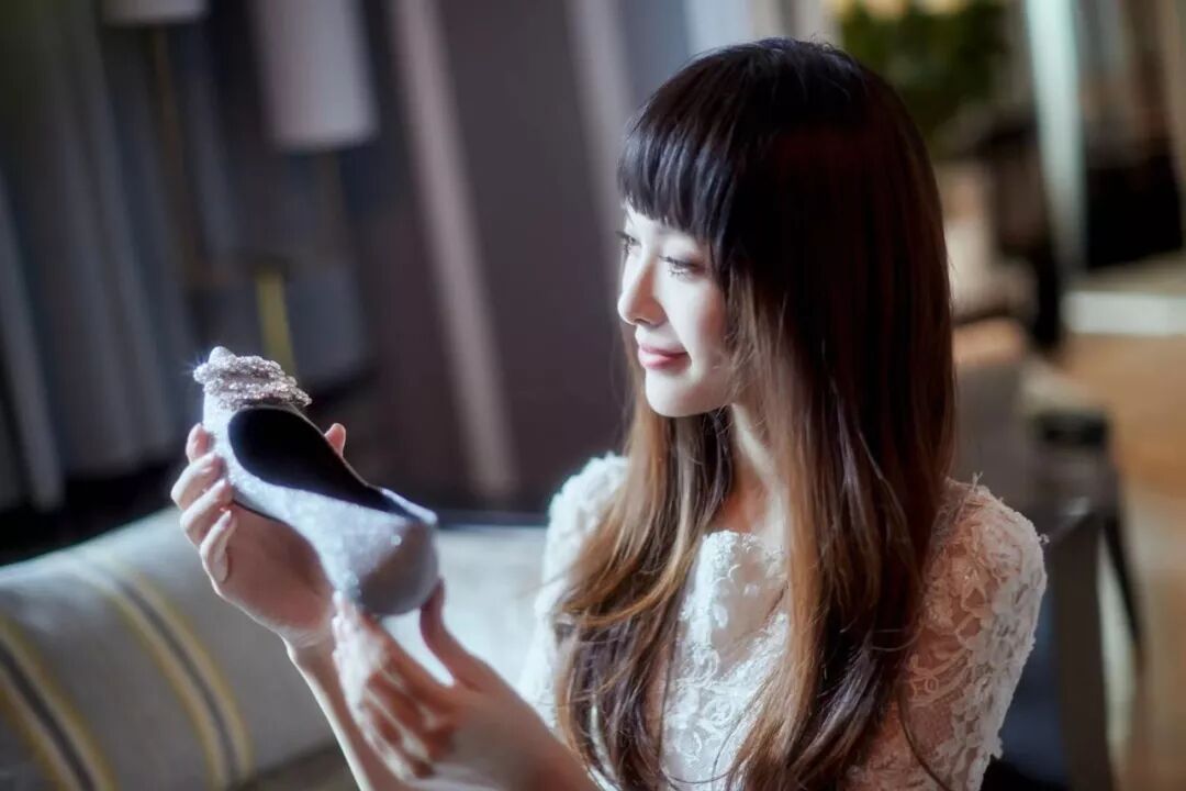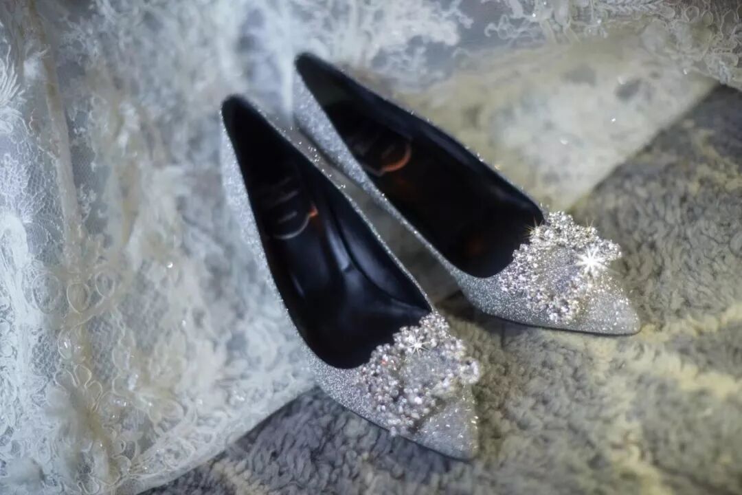 Roger Vivier的闪银花钻水晶鞋随着新娘走向新郎的每一步闪闪发光