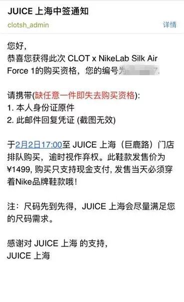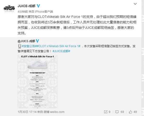由于陈冠希的特别关注,Juice 北京和成都店铺,也立马进行了响应,微博上发表了声明,向各位粉丝说明了情况,短信系统崩溃,同时成都店铺还将发售方式由短信预约改为了线下现场抽签。