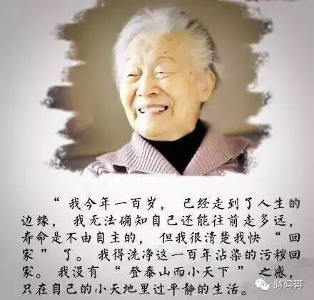 在这篇问答结尾处,杨绛说,“我今年一百岁,已经走到了人生的边缘边缘,我无法确知自己还能往前走多远,寿命是不由自主的,但我很清楚我快‘回家’了。我得洗净这一百年沾染的污秽回家。我没有‘登泰山而小天下’之感,只在自己的小天地里过平静的生活。