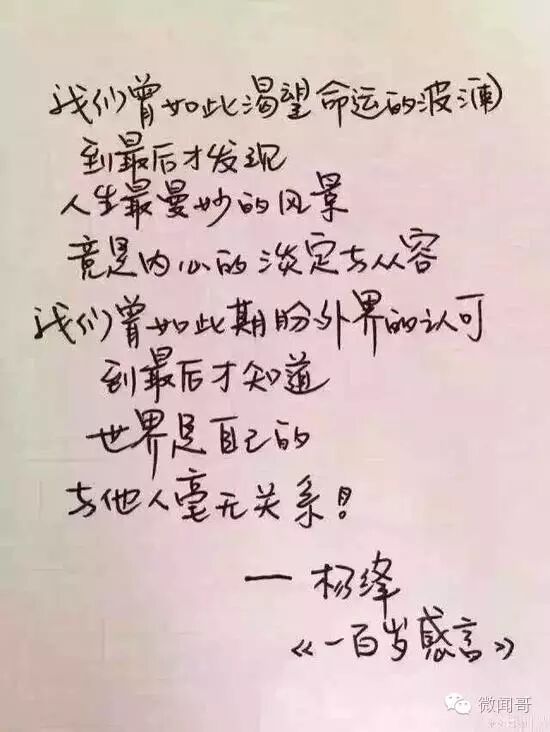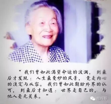 “我们曾如此渴望命运的波澜,到最后才发现,人生最曼妙的风景,竟是内心的淡定和从容。我们曾如此期盼外界的认可,到最后才知道,世界是自己的,与他人毫无关系。”这一段被署名为杨绛百岁感言的话,显得鸡汤味十足。有的还以手写体在网上传播。封面新闻记者从人民文学出版社获知,“我们的责编跟杨绛先生本人确认过,这不是她的话,手写体的也不是她写的。”