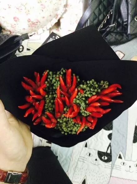 火锅配菜有了,火锅调料怎么能落下?于是重庆的“女皇”送了陈伟霆花椒朝天椒花束。