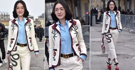 这套Gucci 2016春夏系列刺绣白色套装,小s就是穿着它参加了第一场大秀。而且一向喜欢搞怪的小s还专门配了复古发型和蛤蟆镜,倒是穿出了点独特的风味,虽然……始终还是透着一股教导主任的即视感。