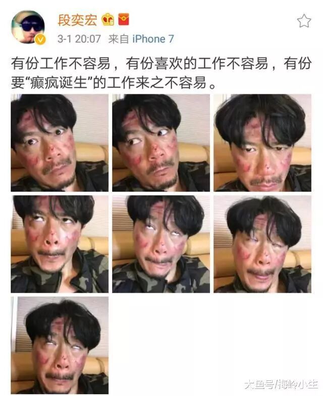 不疯魔,不成活。段奕宏刚刚在微博上分享了一组照片,是自己的日常工作照,触动了无数网友的心,满脸伤痕淤青,看起来触目惊心。段奕宏并配文:有份工作不容易,有份喜欢的工作不容易,有份要“癫疯诞生”的工作来之不容易。