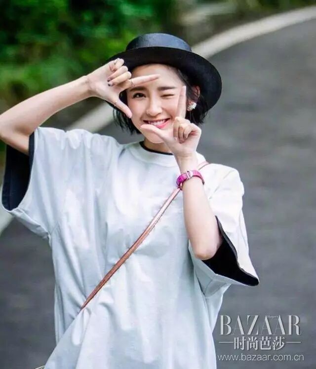 性格活泼的妹子,在照相的时候就比较适合唐艺昕这个搞怪手势挡脸法。用手比出不同的形状,不仅可以巧妙修饰脸部的线条,还能让照片的整体画风可爱力十足!