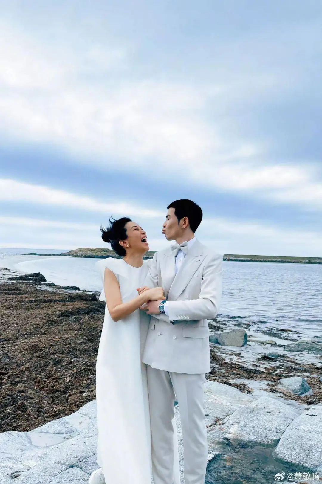 照片中,萧敬腾身穿银灰色西装,妻子林有慧身穿白色长裙,两人站在海边,幸福溢出屏幕。