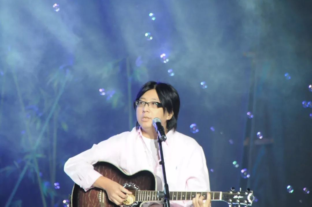 歌手袁惟仁怀抱吉他,低吟浅唱。